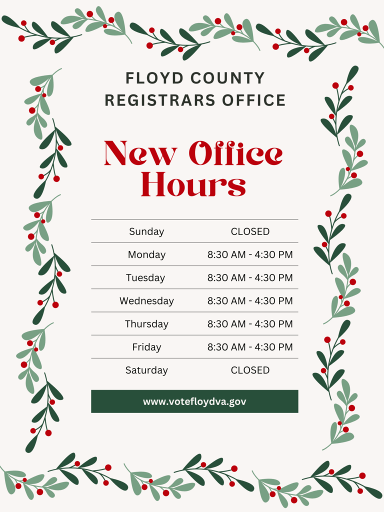 The Office of Elections promotes and supports accurate, fair, open and secure elections for the citizens of Floyd County, Virginia.