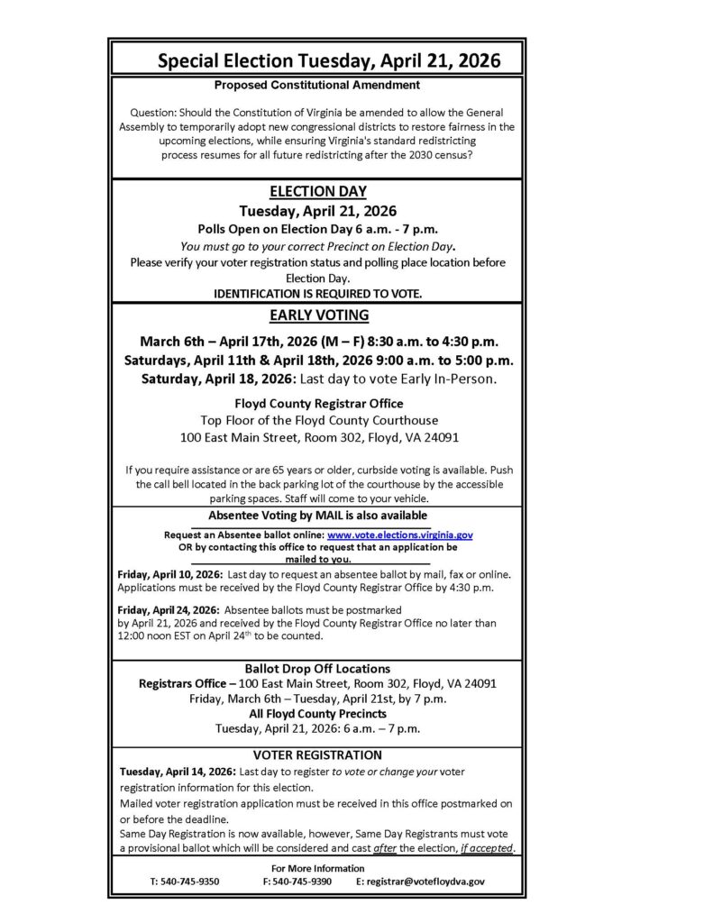 - Early Voting: March 6 – April 17, 2026 (Monday – Friday 8:30 – 4:30pm) at the Floyd County Courthouse
